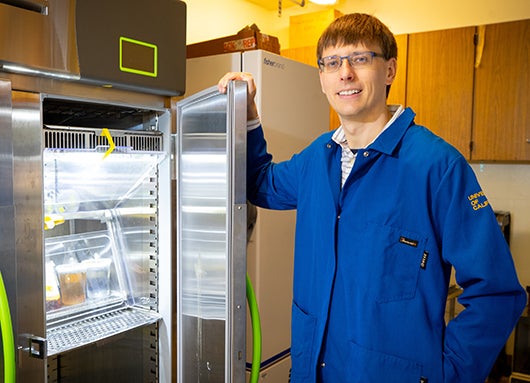 Robert Jinkerson with mushroom cultures (UCR/Stan Lim)